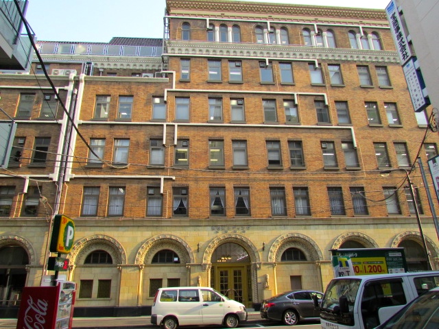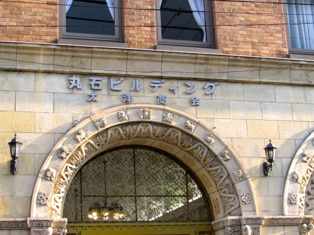 全体のデザインは、ロマネスク様式で、1階外壁は石材を利用し、2階以上はスクラッチタイル張りとしています。1階のアーチと随所のレリーフがなかなかのものです。
