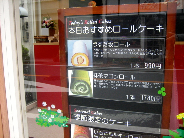 画像は、臼田坂沿いにあったケーキ屋で見つけた坂の名前が付いたロールケーキの看板です。