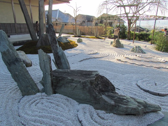 渦を巻き、様々な流れを見せる白砂を雲海に見立てて、天空を自在に奔る龍を石組みであらわしています。