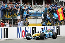 優 勝はルノーのアロンソで今季6勝目、通算7勝目をマーク。ポイントを87点に伸ばし、チャンピオンシップでさらに優位に立った。2位は鬼神の追い上げを見 せたモントーヤ。痛恨のリタイアに泣いたライコネンに代わって、チームに8ポイントを加算している。そして、3位表彰台はB・A・R Hondaのバトン。苦戦続きのチームに3戦連続のポイントをもたらした。
