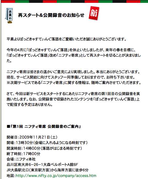 ぽっどきゃすてぃんぐ落語、再開のお知らせがアップされていました。