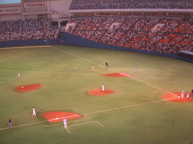 昨今、1リーグ制などで騒がれているプロ野球ですが、人の入りは思ったより多かったです。外野の方には「合併反対」「1リーグ制反対」の横断幕がありました。