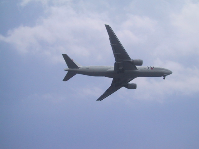 飛行機が迫力満点で見えます。よく見ると、車輪が出ているのが分かると思います。こんな間近で着陸態勢に入っている飛行機を見られるなんて、かなり感激しました。