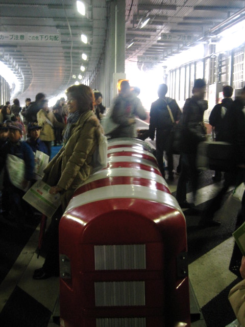 女の人が寄りかかっているのは、分岐部衝撃緩和装置(新型クッションドラム)。