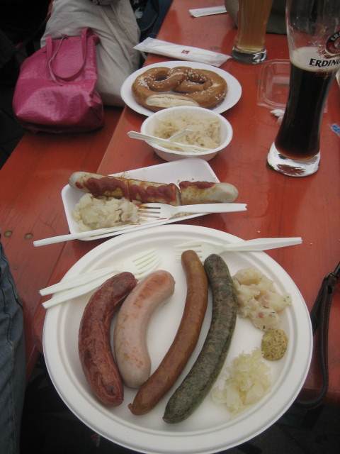 上からプレッツェル(塩味)・ザワークラウト(キャベツの酢漬け)・フランクフルト
