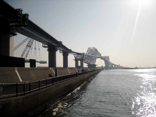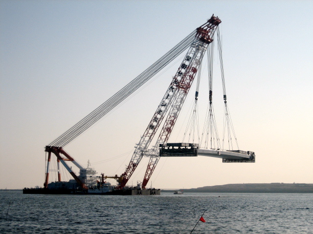 もう、この位置からでもすごい迫力。左にちらっと写っているのは、明日架けられる橋桁とクレーン船。