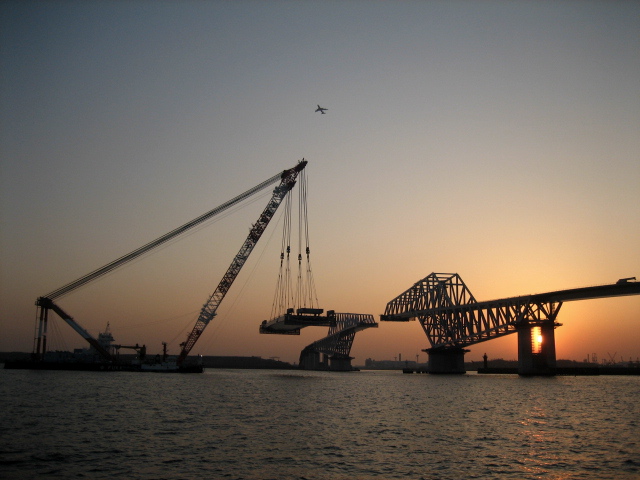 偶然にも、明日は最後の桁の架設工事。中央部橋桁架設工事。これでようやく、橋が繋がるわけです。