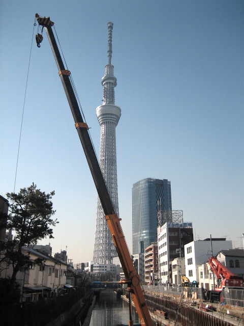 前回に引き続き、北十間川の遊歩道を工事中のため、クレーンがあります。