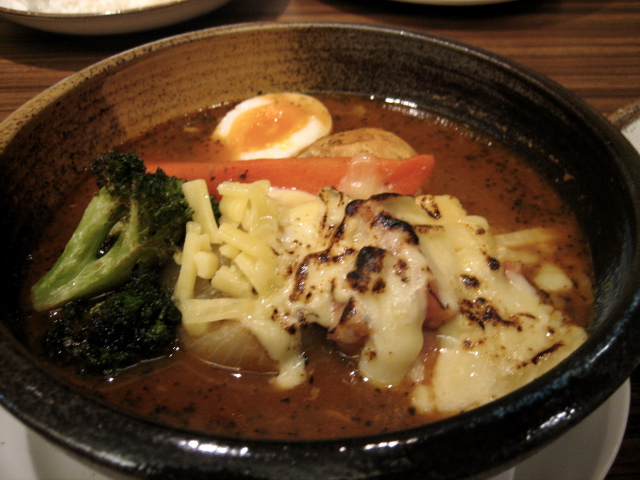 今回は、焼きチーズと丸ごとタマネギの厚切りベーコンのスープカレー(¥1,200)を4辛で注文。