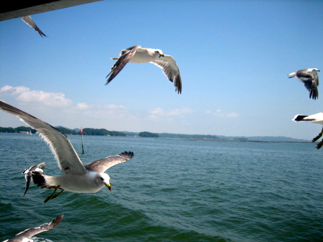 ただ、船内にいるの退屈なので、船外に出てかもめに餌をあげていました。