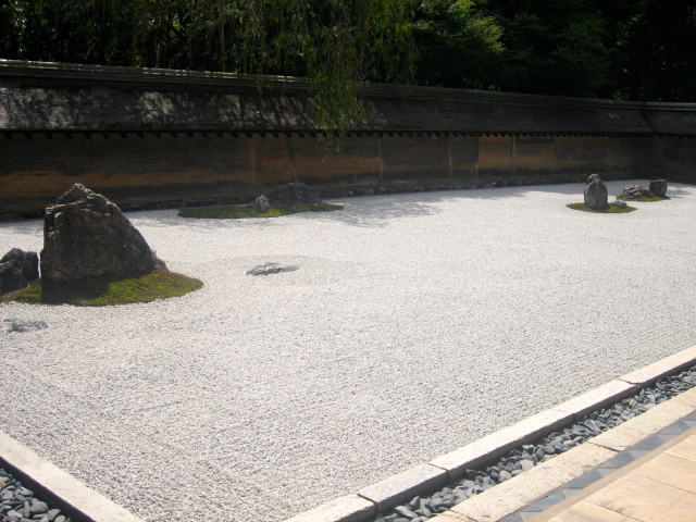 長方形の敷地の中に白砂を敷き、十五個の意思を配し。一木一草