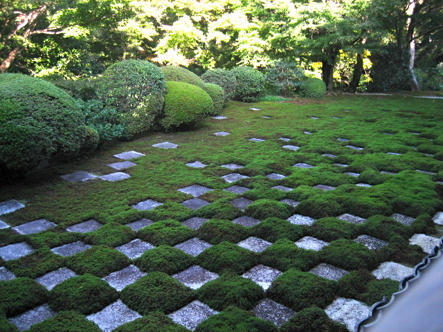 ウマスギゴケの緑との対比も色鮮やかな市松模様の敷石は、恩賜門に使われていたものである。