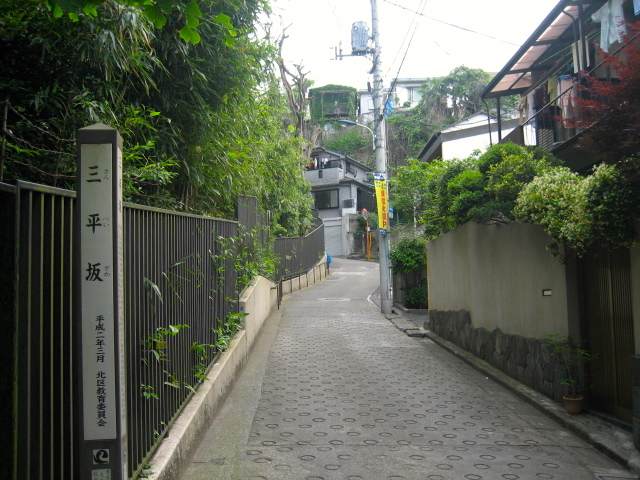 坂名の由来は、江戸時代の絵図にある三平村の名からとも、室町時代の古文書にある十条郷作人三平の名からともいわれている。農家の人が水田へ下る通路であったが、名主の滝への道としても利用されたようである。
