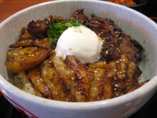 おいらがオーダーしたのは、合盛カルビ丼特盛(¥790)(キムチ、みそ汁付)とトッピングで、温泉卵(¥100)です。