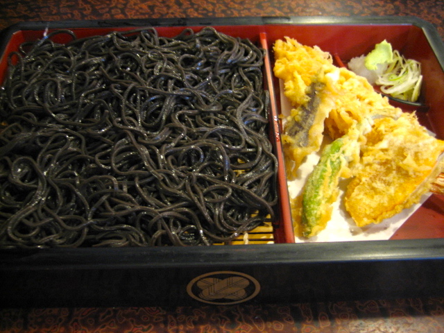名物の黒切りそばの天もりです。昆布を加工して、この黒色になっています。