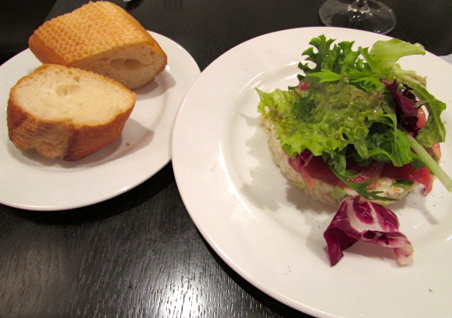 プリフィクスコース(コーヒー、紅茶付)¥1,100(前菜:マグロのカルパッチョ ライスサラダ仕立て(上)、主菜:牛・豚・春キャベツのハンバーグ デミグラスソース(下))