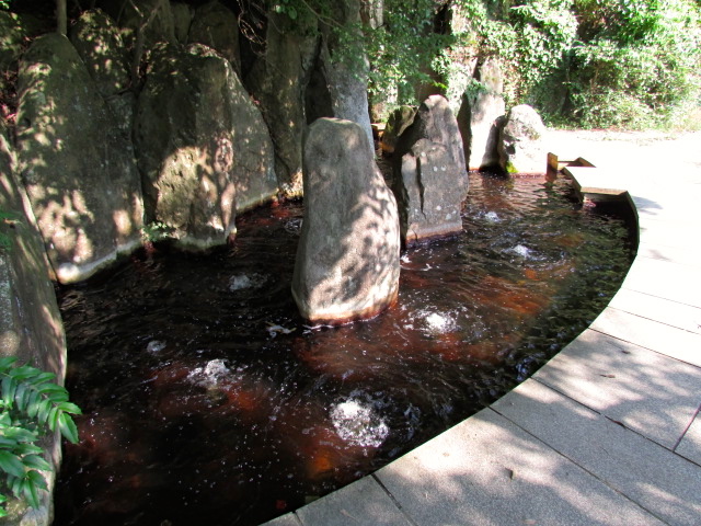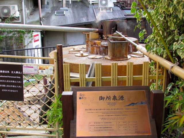 こちらは、御所泉源と言われるとことろで、金泉と言われる鉄分と塩分が含まれていて特に塩分濃度が日本一の温泉として有名です。