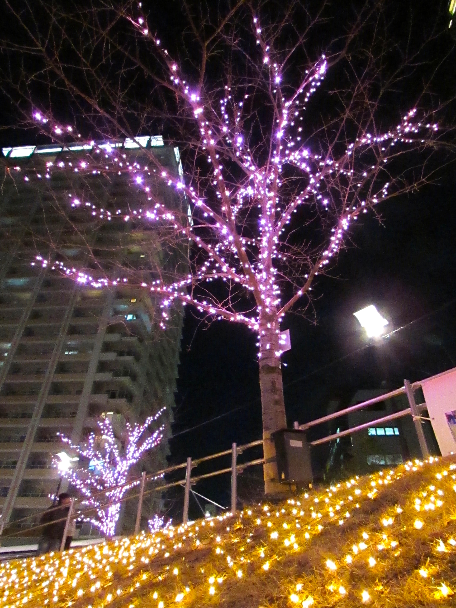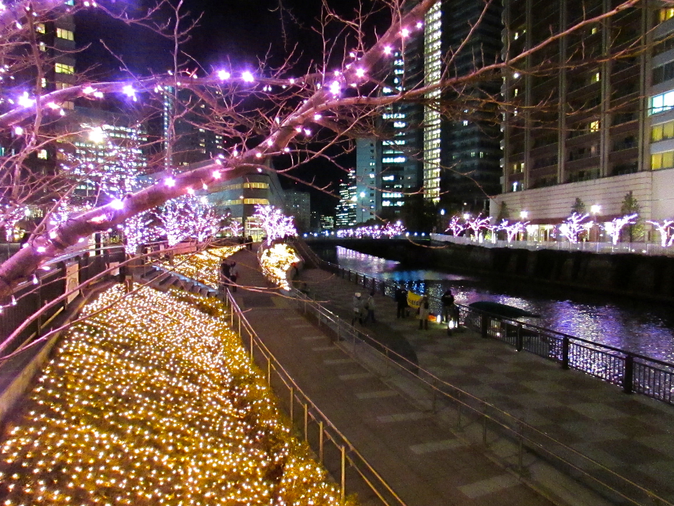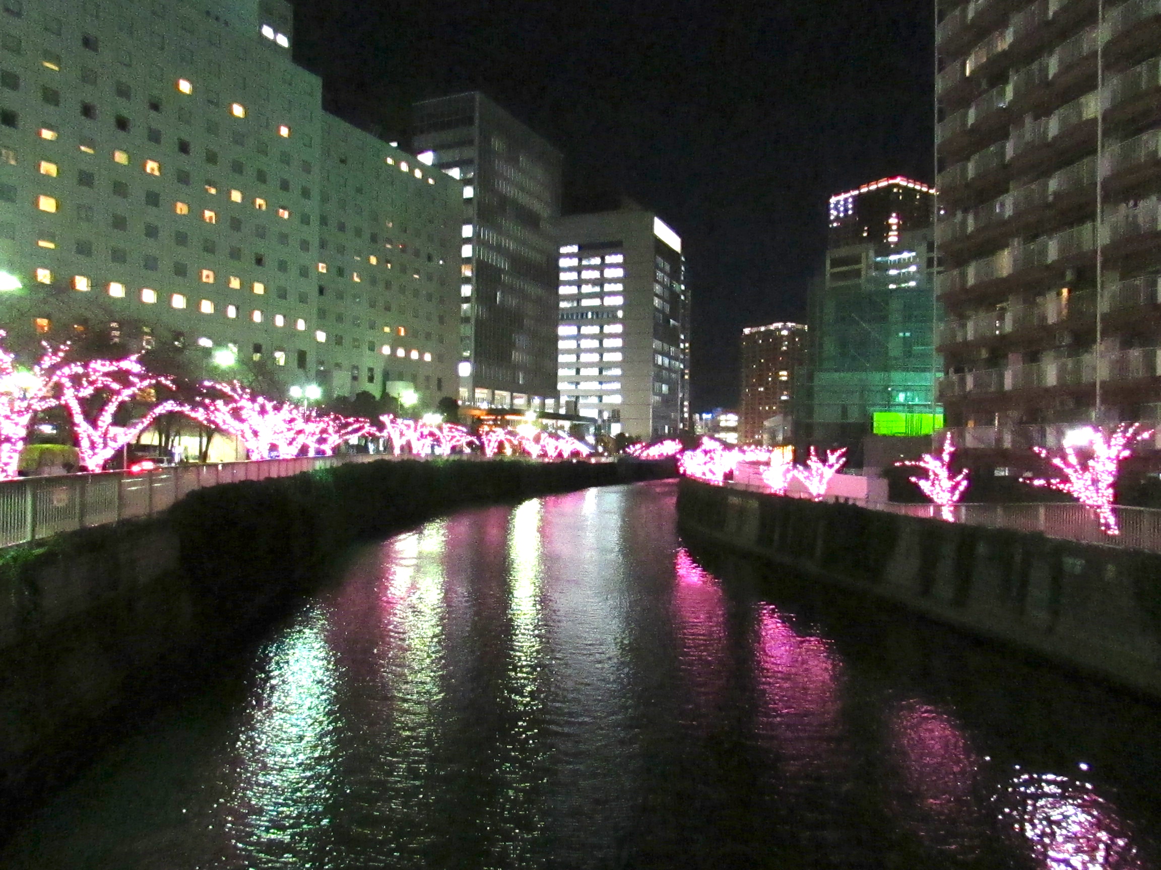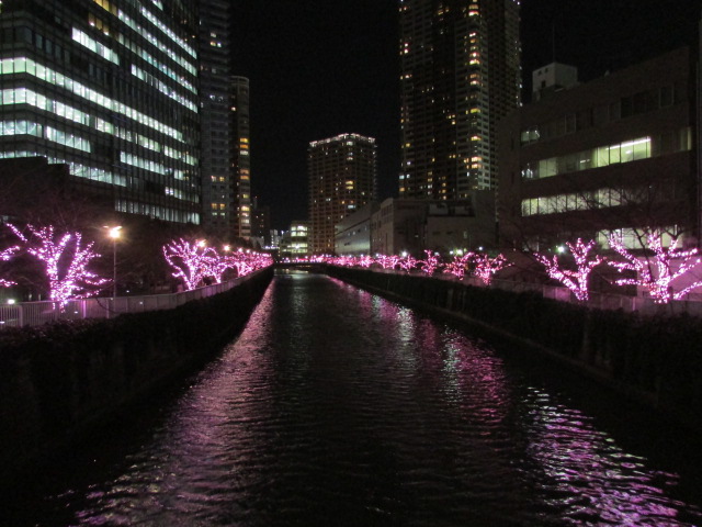 ここのイルミネーションは、コンセプトが目黒川に冬の桜を咲かせようということなので、イルミは桜色になっています。