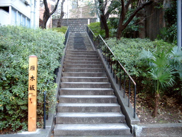 階段になった坂を一般的に雁木坂というが、敷石が直角に組まれていたから等ともいい、当て字で岩岐坂とも書く。