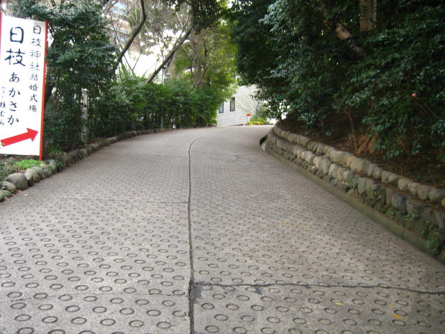 この坂を山王女坂といいます。 赤坂にある日枝神社の表参道です。 正面の石段に対しその名がつけられています。 また、別の名は御成坂ともよばれています。『東京名所図会』には「左緩やかに通ずる石階を女坂と呼ぶは非なり。昔時将軍家御成の節、峻坂を避け、此坂のみ御通行遊ばされしにより、御成坂と申待るを女坂と聞誤りしにはあらぬかと書かれています。