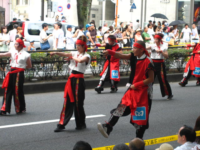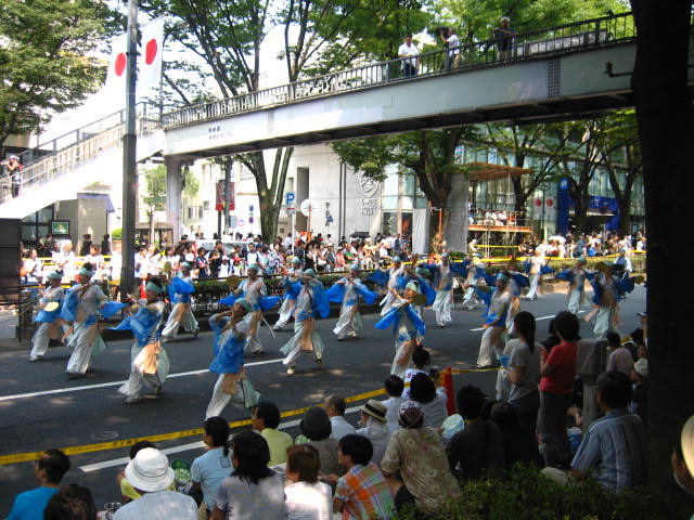 いや~、初めて見たけどすごいね。こんな、猛暑にも負けずみんな踊っています。いくつかの会場に分かれているのですが、おいらが観たのは表参道会場。明治通りから青山通りの間を交通規制していて、そこで踊っていました。