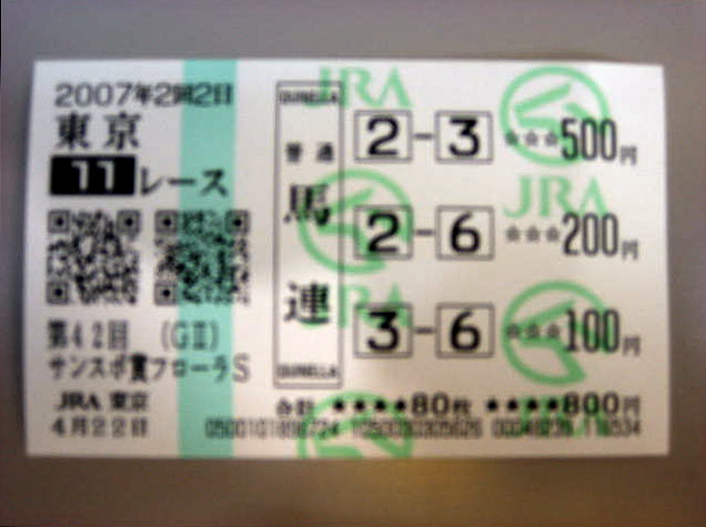 競馬に来たので、ちょこっとだけやってきました。やったのは、8レースとメインのフローラSです。8レースの方は外したけど、メインはしっかりと、とりま した。狙っていた馬がいたんだけど、パドックでその馬を見て「こりゃ~、来ないなあ」と思ったので消して、本命を狙ってとりました。