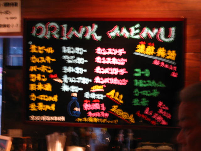 ちなみに、ビールも100円(ジョッキは200円)だけど、発泡酒ではなくて、普通のビールです。ピンぼけいていますが、Drinkメニューを写してみました。